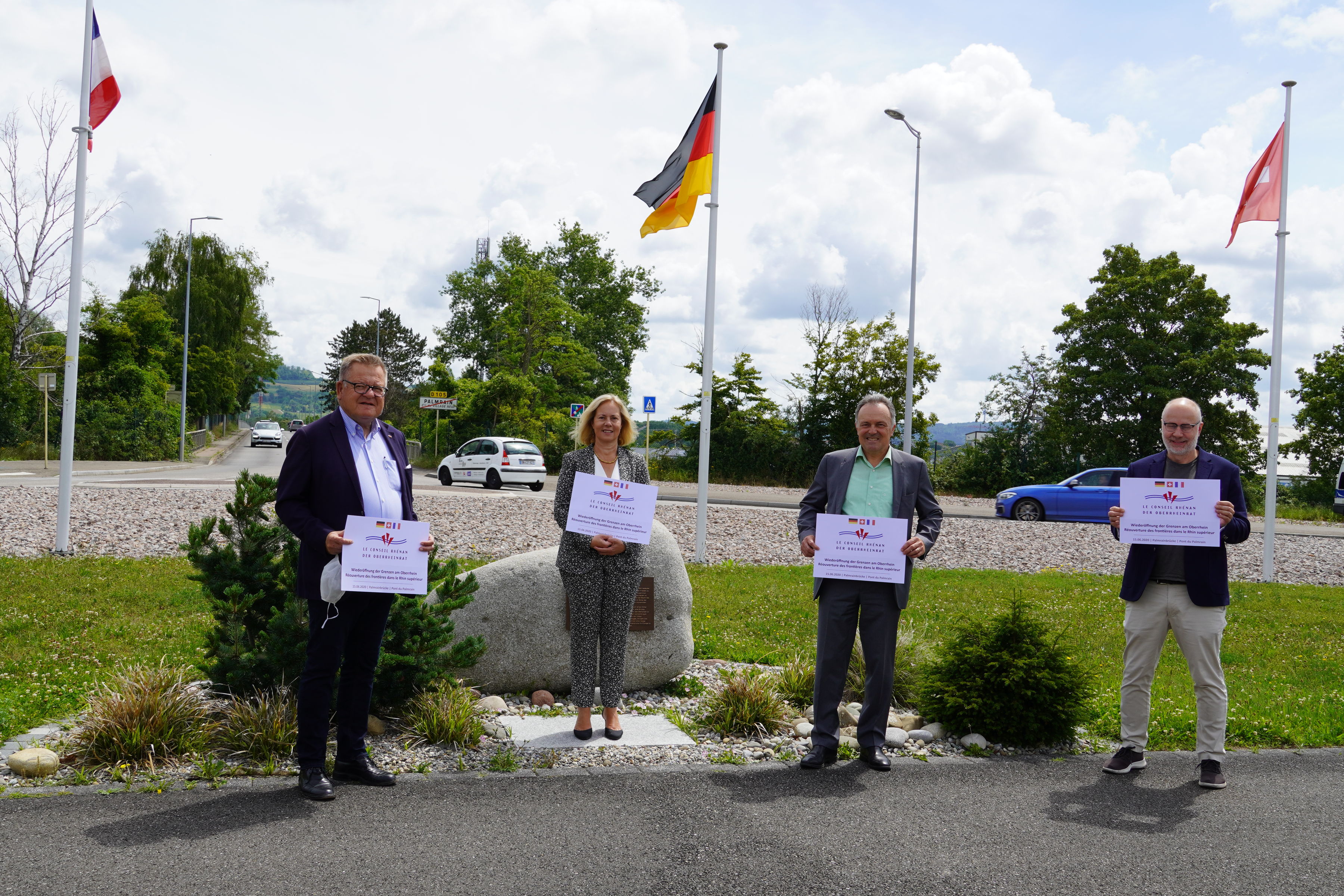 Trotz der Einführung vorübergehender Grenzkontrollen und Grenzschließungen ab dem 16. März 2020 war der Oberrheinrat durchgehend aktiv und handlungsfähig. Heute, 91 Tage später, trafen sich Josha Frey, Präsident des Oberrheinrats, und die drei Vize-Präsidenten Christian von Wartburg (Nordwestschweiz), Theo Kautzmann (Rheinland-Pfalz) und Claudine Ganter (Grand Est) erstmals wieder „analog“ auf der Palmrainbrücke zwischen Weil am Rhein in Baden und Village-Neuf im Elsass.